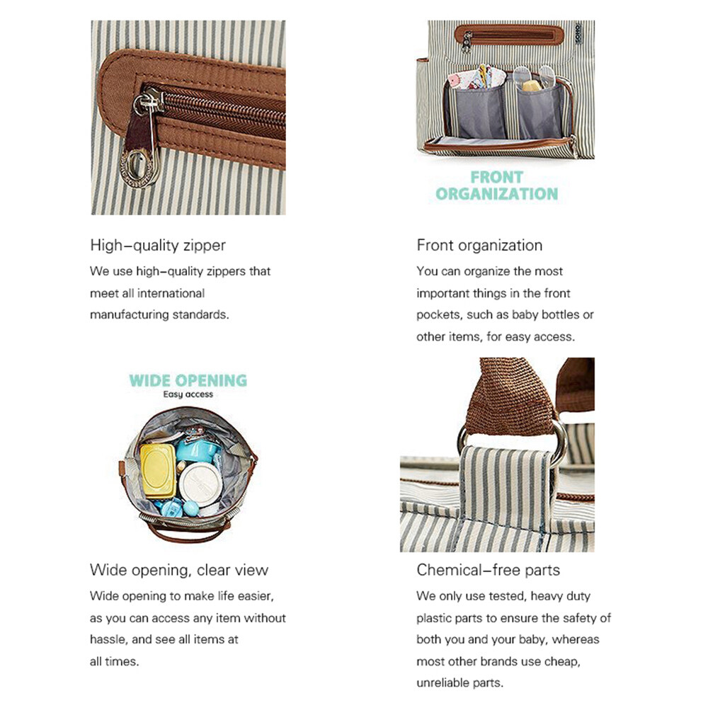 7-piece diaper bag set: 1. Extra roomy main compartment, diaper bags with multiple pockets, reliable zip-top closure, with carrying strap.