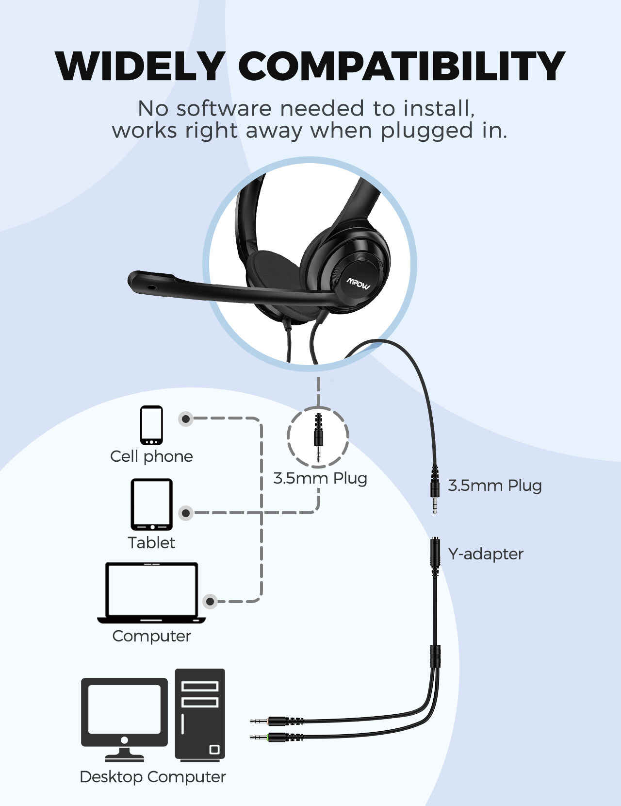 Mpow HC9 Wired Computer Headset, Lightweight Office On-ear Headphones with Microphone, 3.5mm Jack/1-in-2 Adapter Call Center Headset with Stereo Sound, Comfort-fit Earpad for Classes, Skype, Webinar