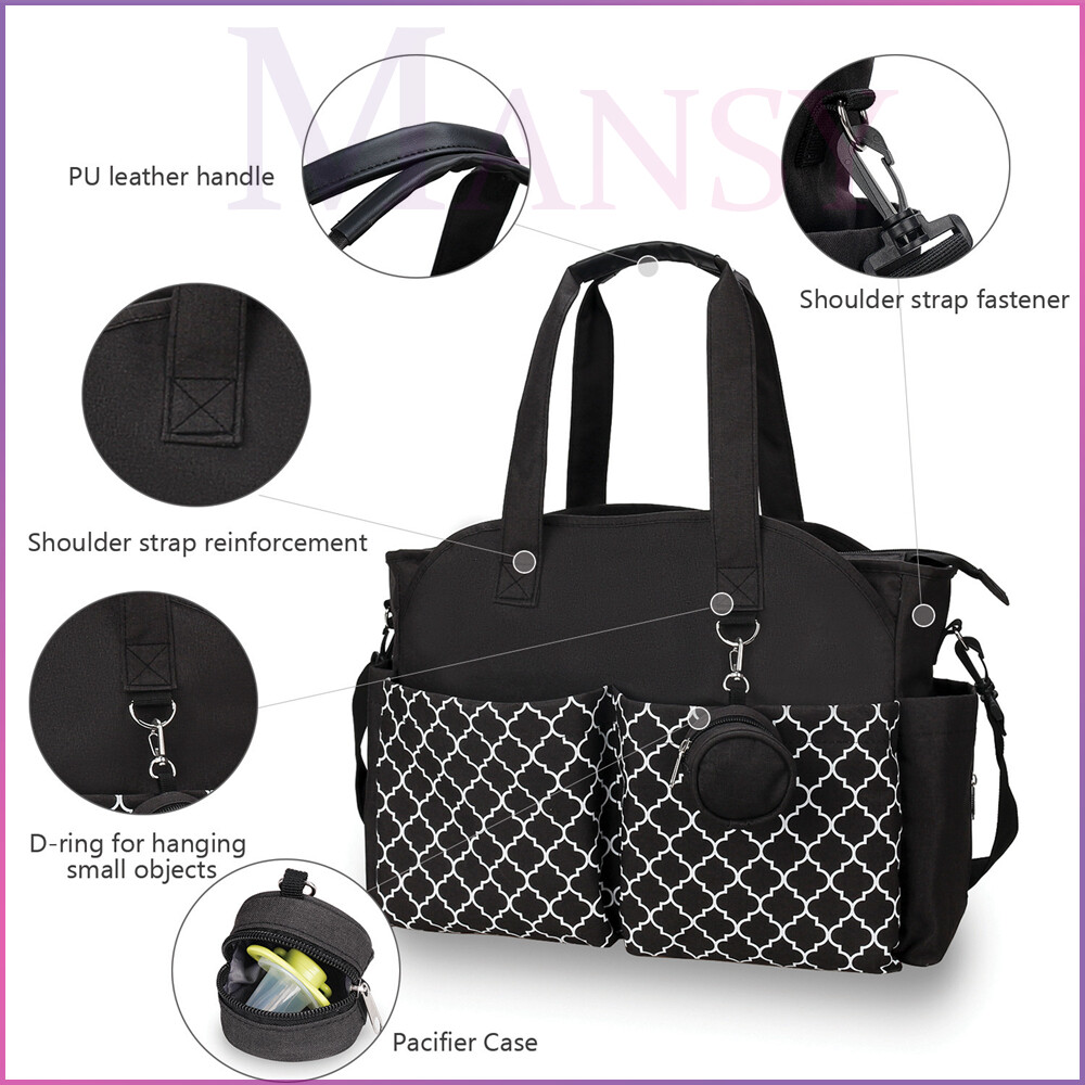 The package contains: 1*diaper bag, 1*Pacifier Case, 1*Adjustable Messenger Strap