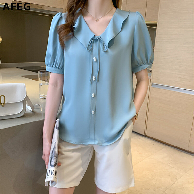 AFEG Korean style women's short-sleeved V-neck chiffon blouse for women