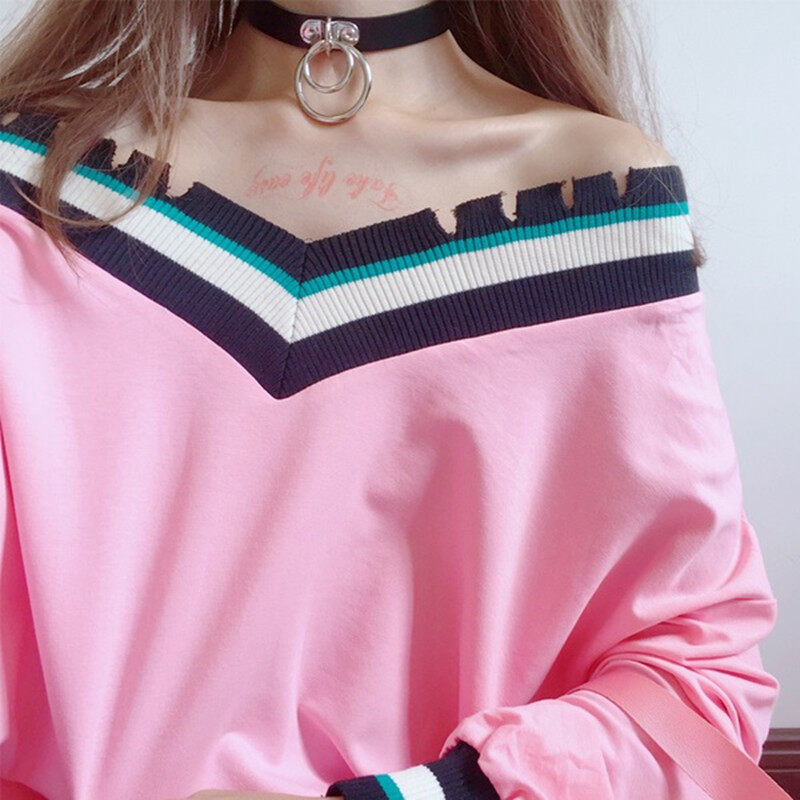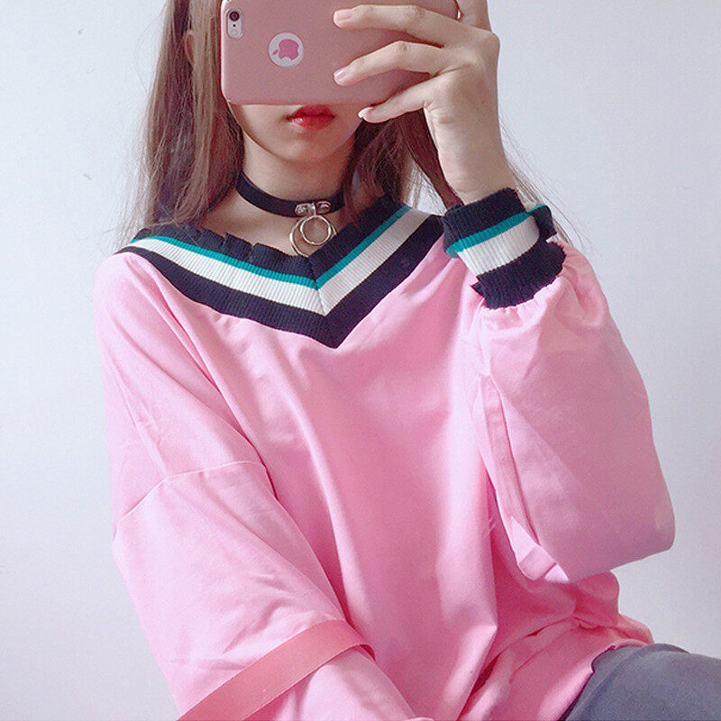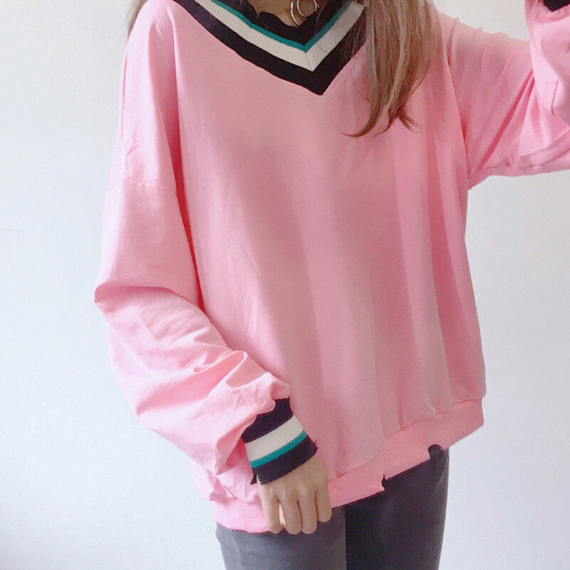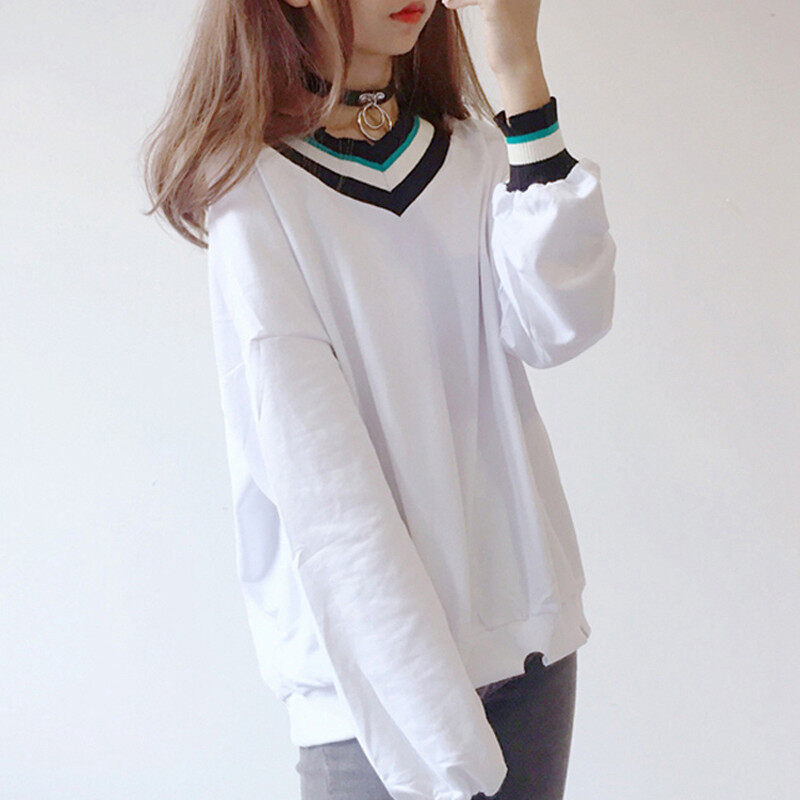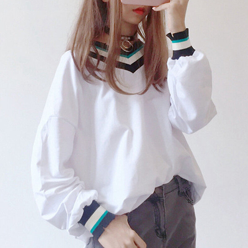 • INWPLLR New Korean Women's T-shirts Striped Patchwork Tshirts Autumn Long Sleeve V-Neck Tops Lady Casual Plain T-Shirts For Women