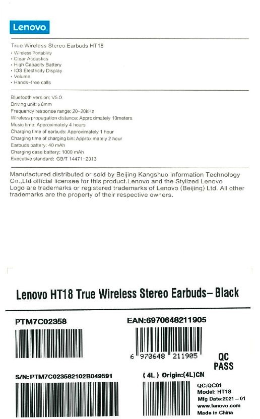 Specification:Brand: LenovoModel: HT18Color: BlackBT version: V5.0Transmission distance: 10mBT matching name: HT18Driving unit: 8mmFrequency response range: 20-20KHzMusic time: About 4 hoursStandby time: About 60 hoursCharging time: About 1 hourBatteryEarbud size: 2.5 * 1.6cm /0.98 * 0.63inCharging case size: 7.5 * 4.8 * 2.5cm /2.95 * 1.89 * 0.98in