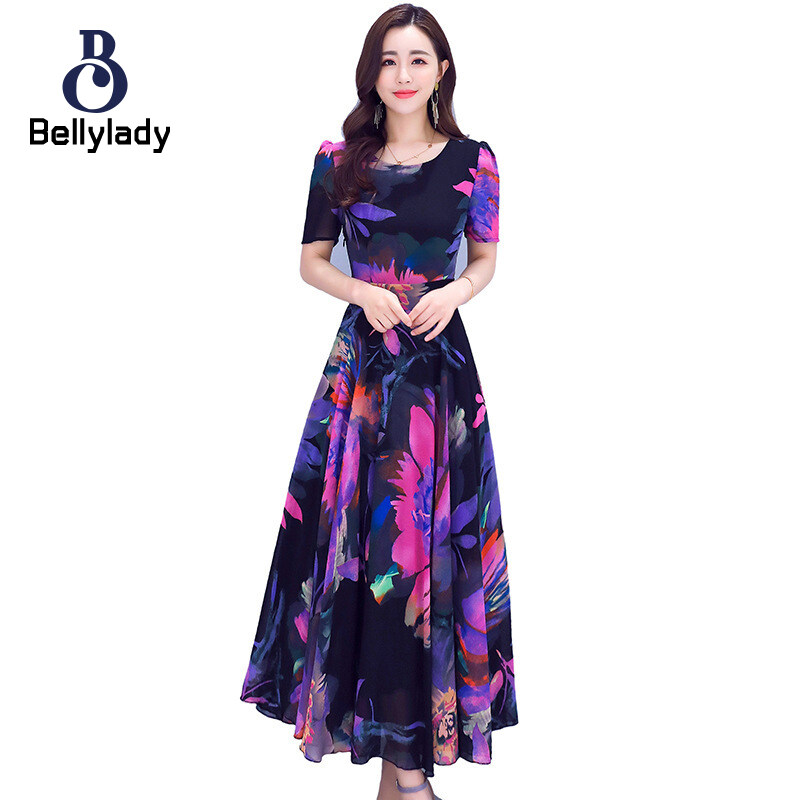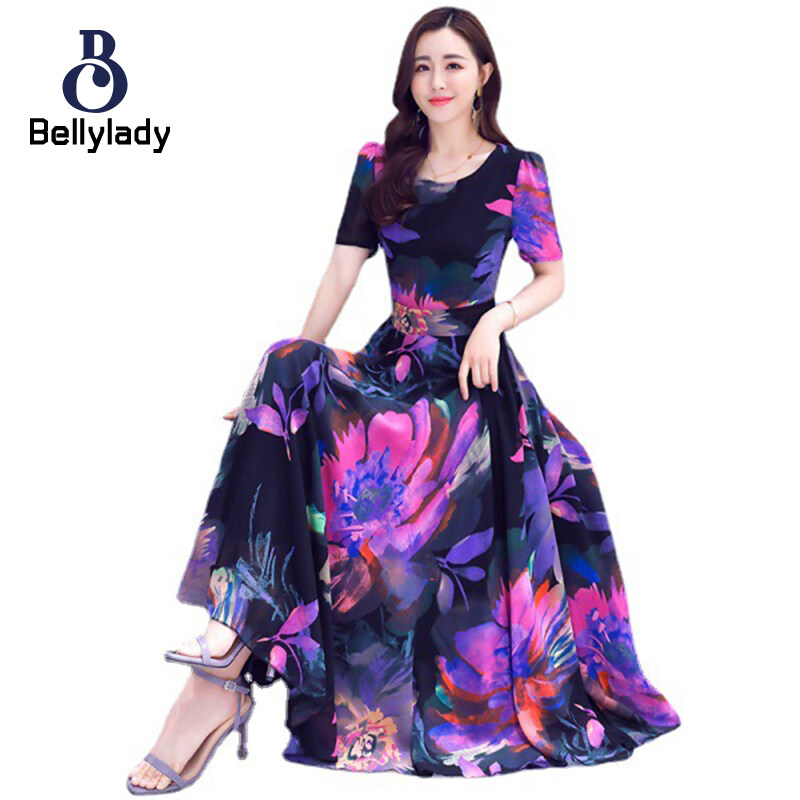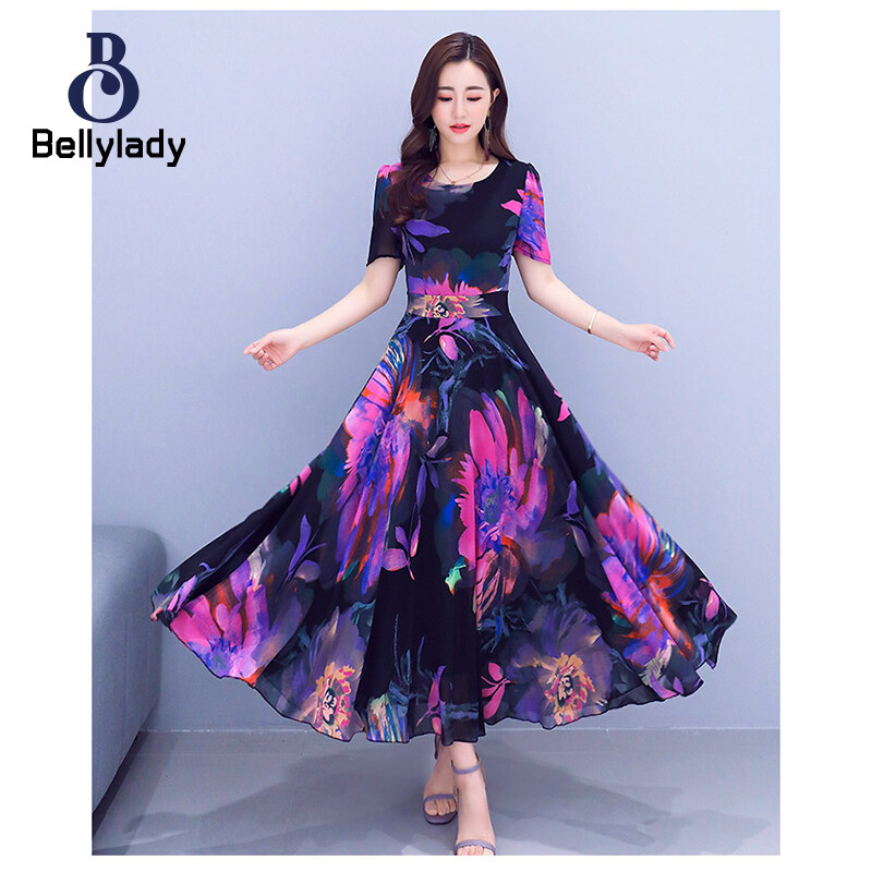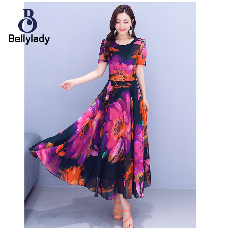 BellyLady Women Dress Plus Size Printed Summer Crew-neck Long Skirt Waist-slimming Big Hemline Dress