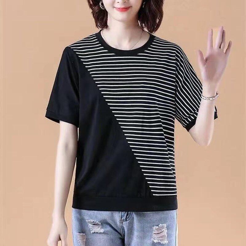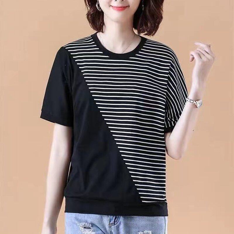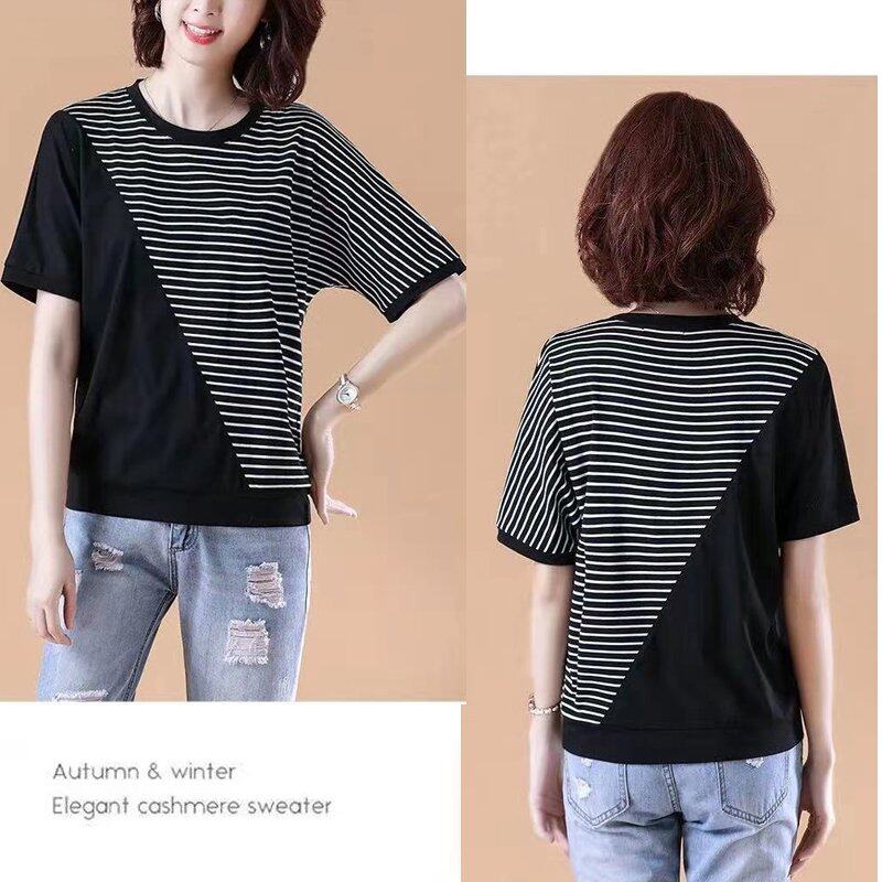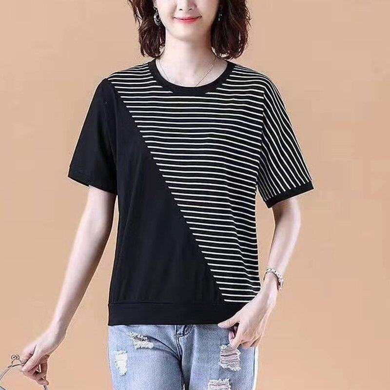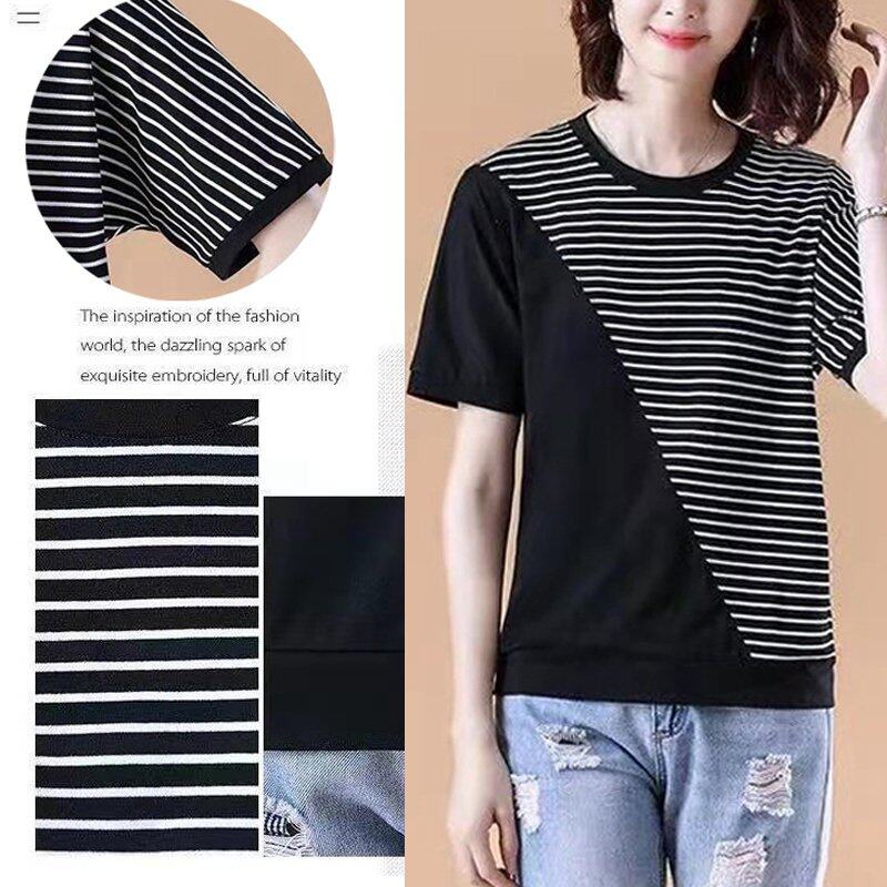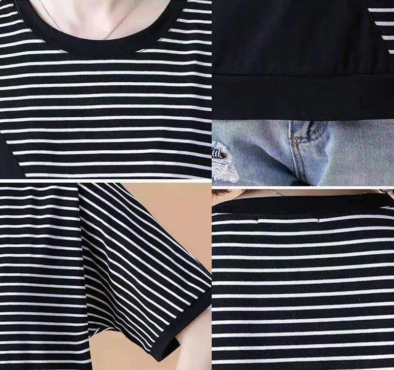 INWPLLR Large Size Women Tops Patchwork T-shirts Casual Loose Short Sleeve Top Korean Stripes Tshirts