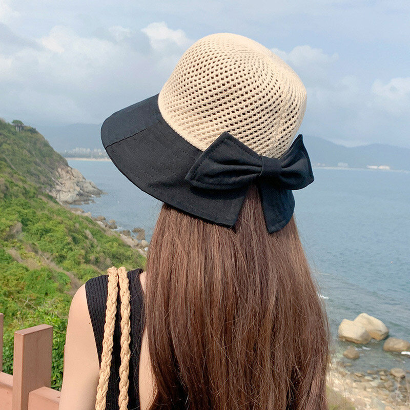 Summer Bow Decor Mesh Dome Bucket Hat for Women Anti UV Sun Hats Folding Outdoor Beach Caps Patchwork Female Cap