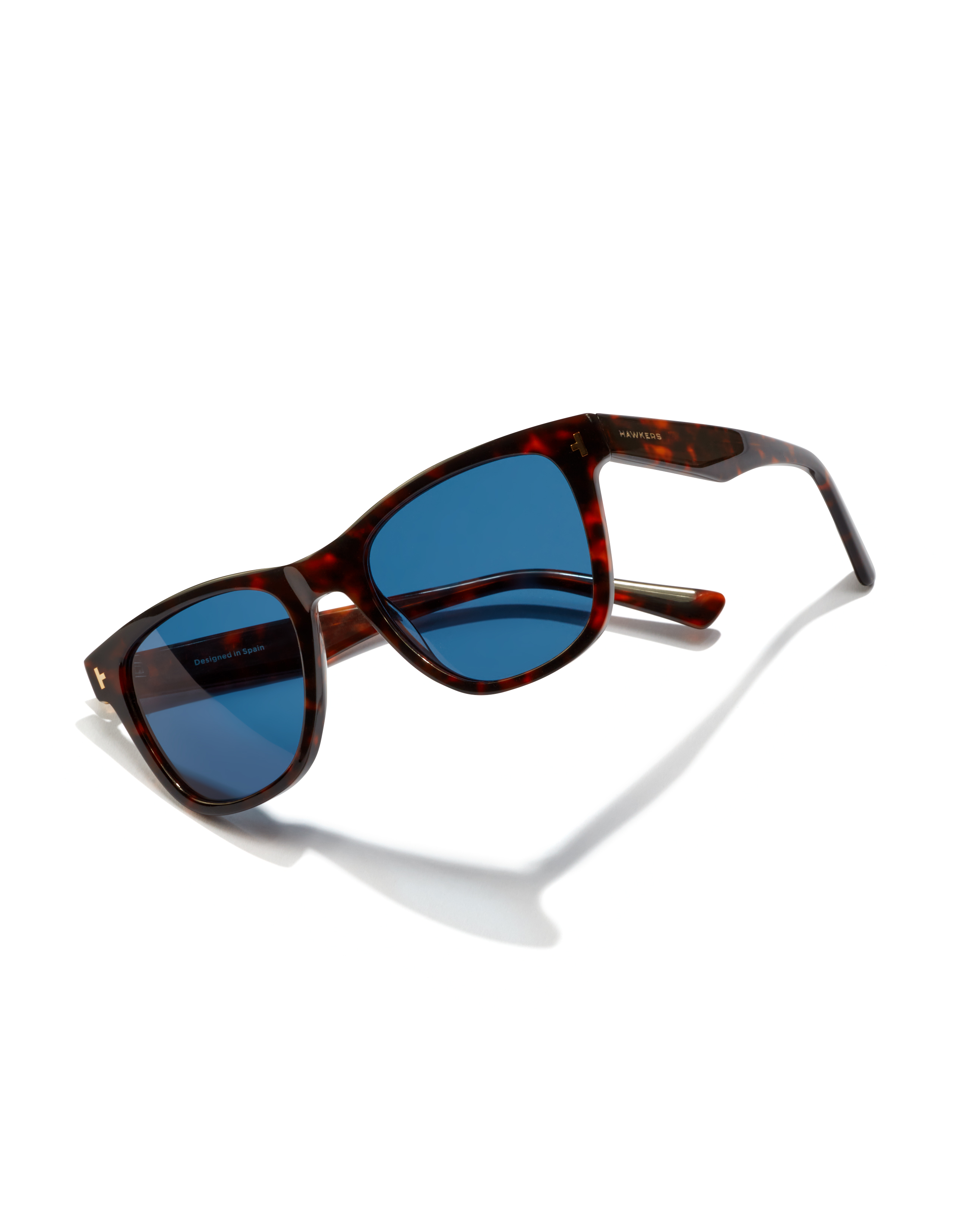Acetate design with a shiny finish and navy blue lenses. The tortoiseshell color permeates the entire frame except for the metallic pins on the front. The arms form a pronounced curve, adding dynamism to this premium version of the classic One.