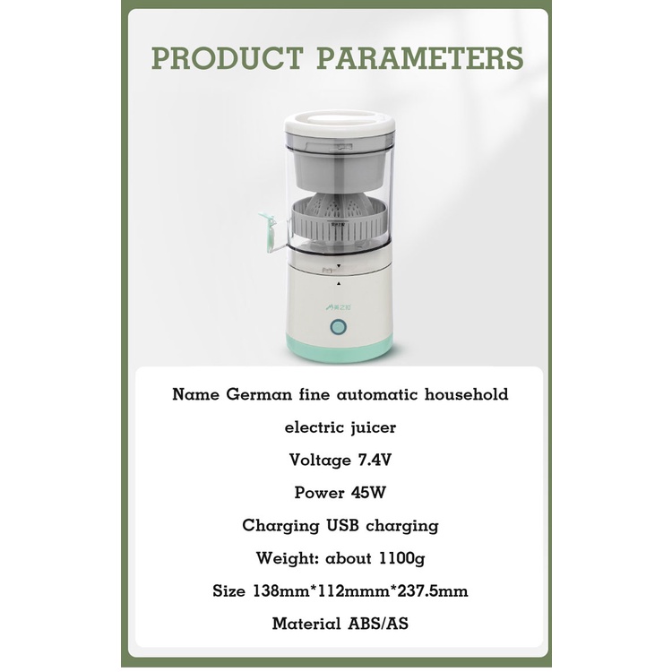 1.Name: wireless electric juicer 2.Voltage: 7.4V 3.Power: 45W 4.Charging: USB charging