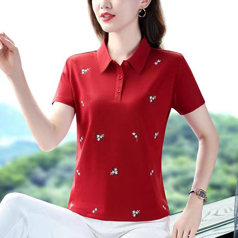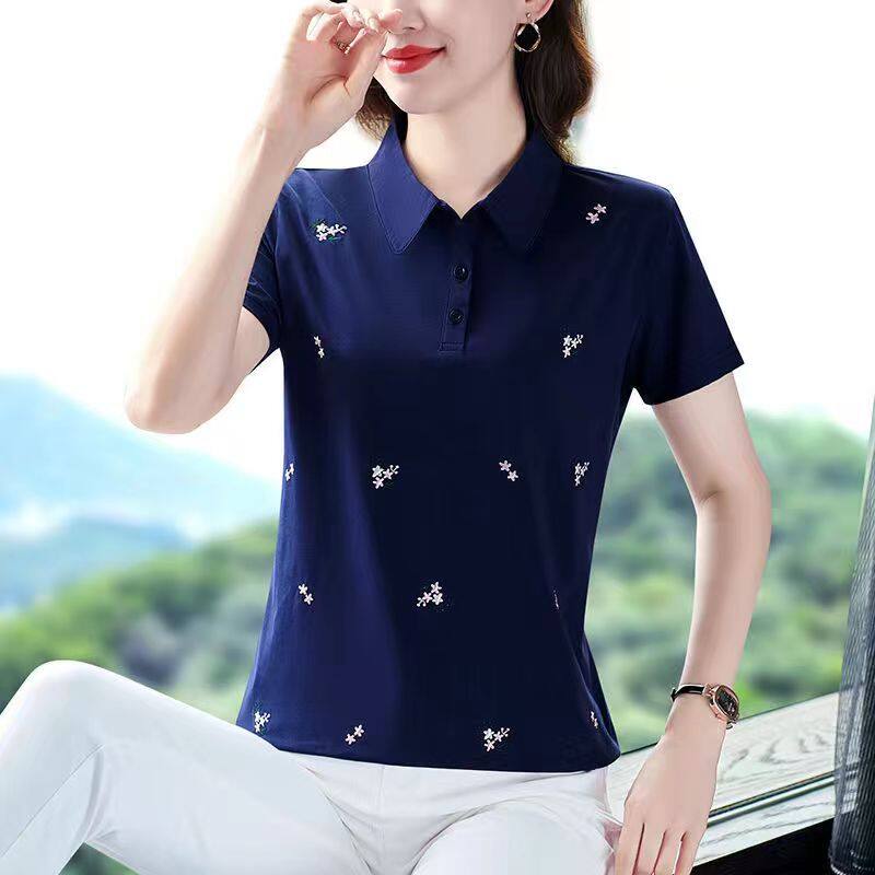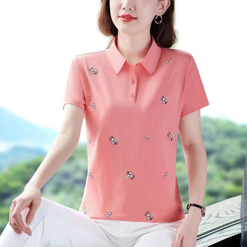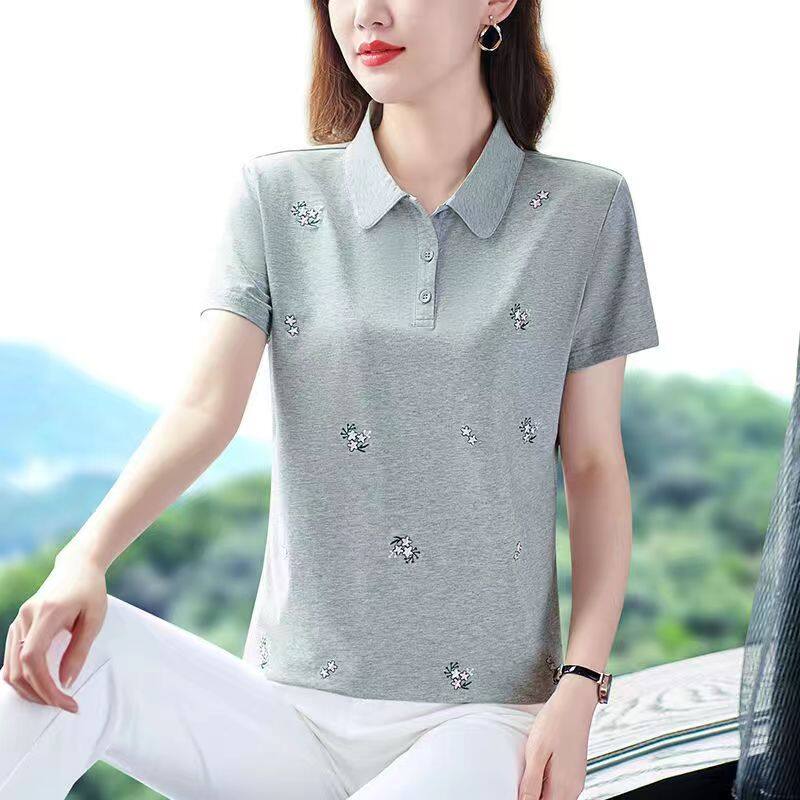100KG Fat Girl Can Wear Elegant Floral Women Short Sleeve Polo Shirt Middle age mother Casual Sport Running Clothes Fashion Plus Size Blouse Ladies Lapel T-shirt Stretch