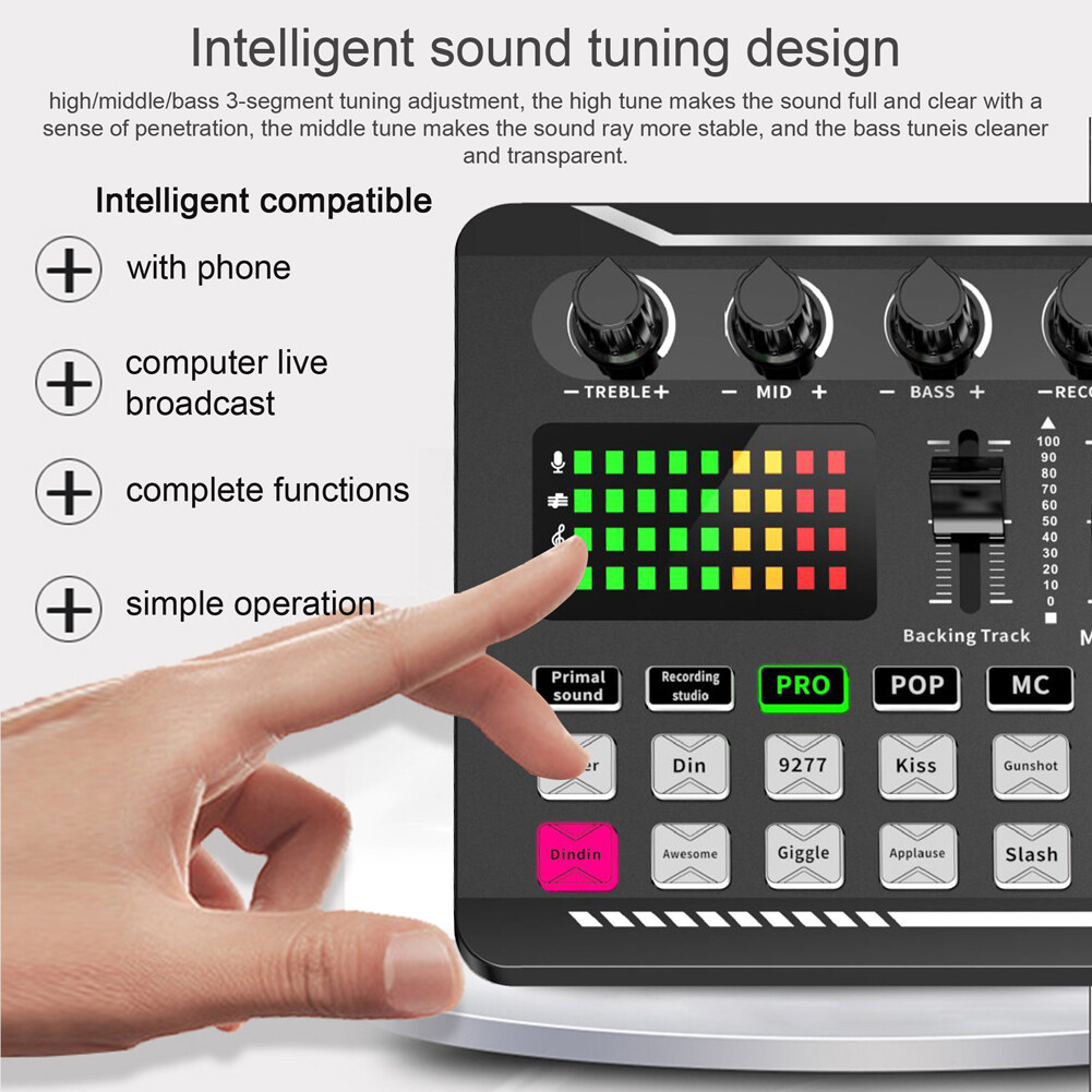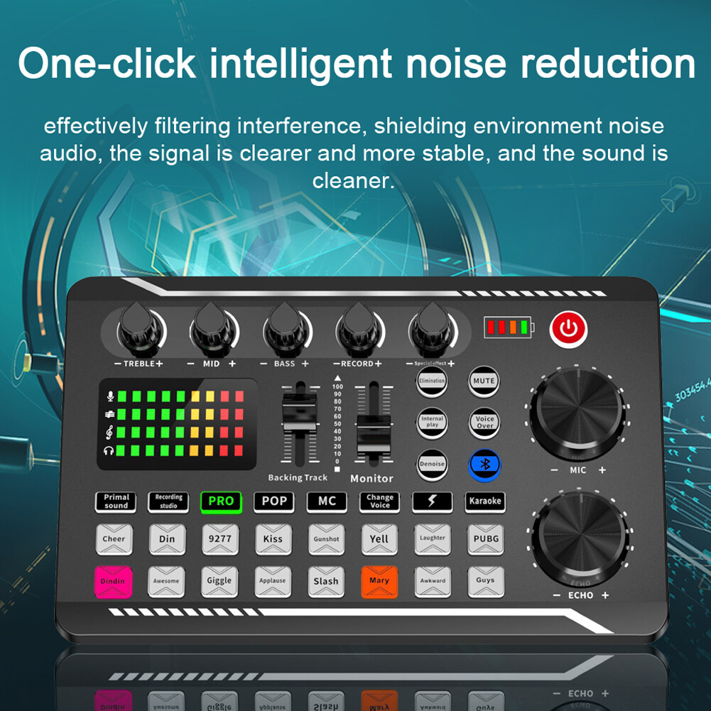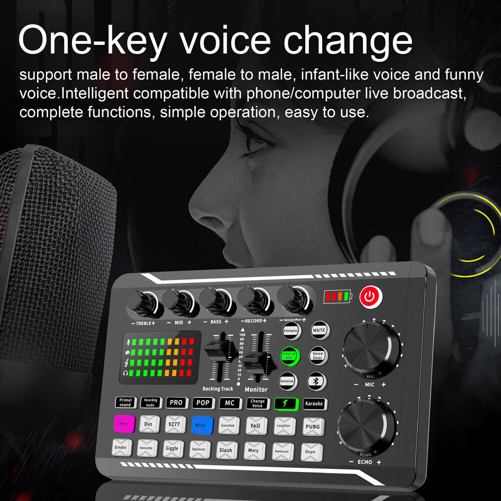 This F998 sound card adopts powerful audio chip, with stable signal, nice sound quality and without delay. Tuning knob design, with 12 kinds of electricity sound and 16 warming up sound effects, support elimination of common sound, live singing, one-button avoidance, real-time monitoring. Intelligent compatible with phone/computer live broadcast, complete functions, simple operation, easy to use. You can have a try.