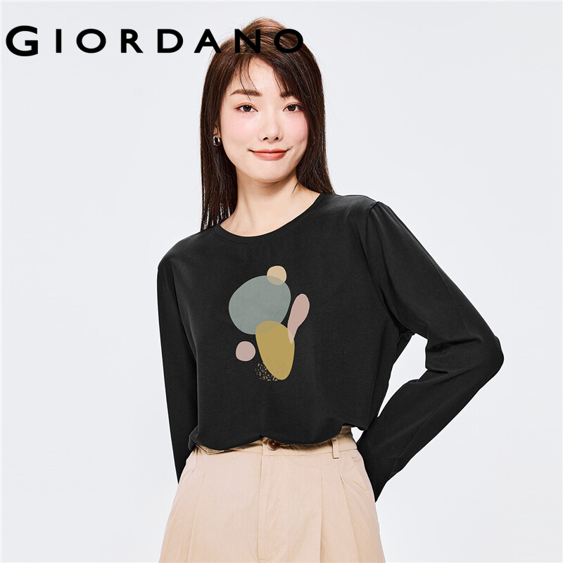 GIORDANO Women Huaxiansheng Series T-Shirts Crewneck 100% Cotton Fashion Tee Simple Print Long Sleeve Casual T-Shirts 99392188