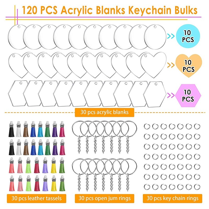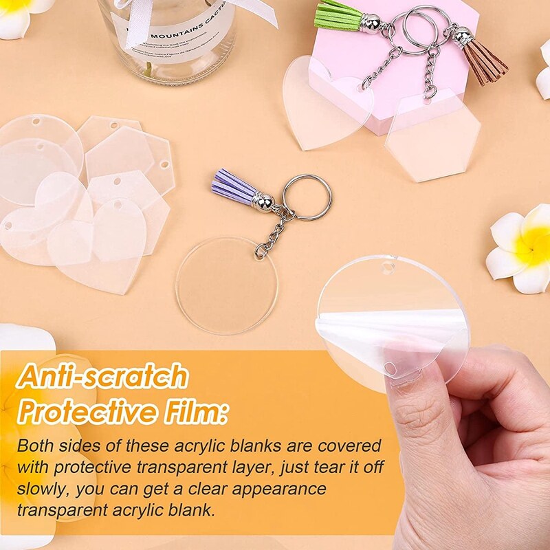 120 PCS Acrylic Keychains Blanks Bulk: Sufficient quantity and different shape, you can share with your family and friends for DIY Craft home Ornament.The tassels are super cute and the acrylic is crystal clear!