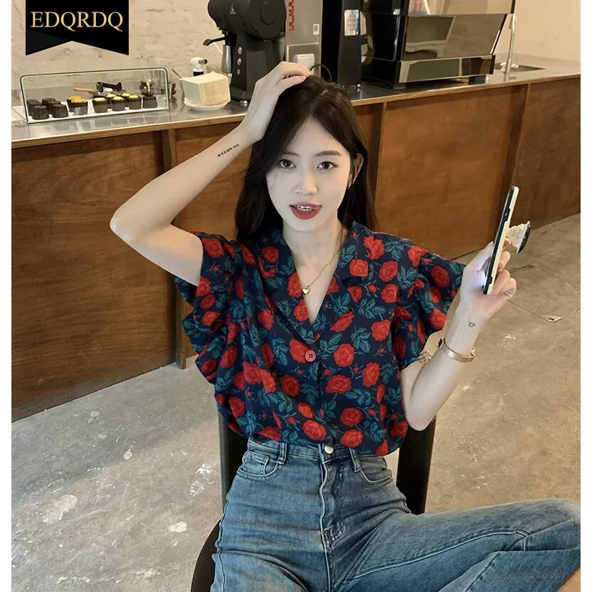 EDQRDQ Floral Tops Ruffles V Neck Petal Sleeve Batwing Blouses for Women