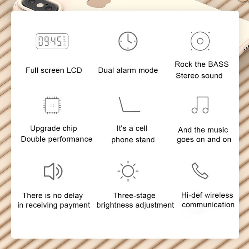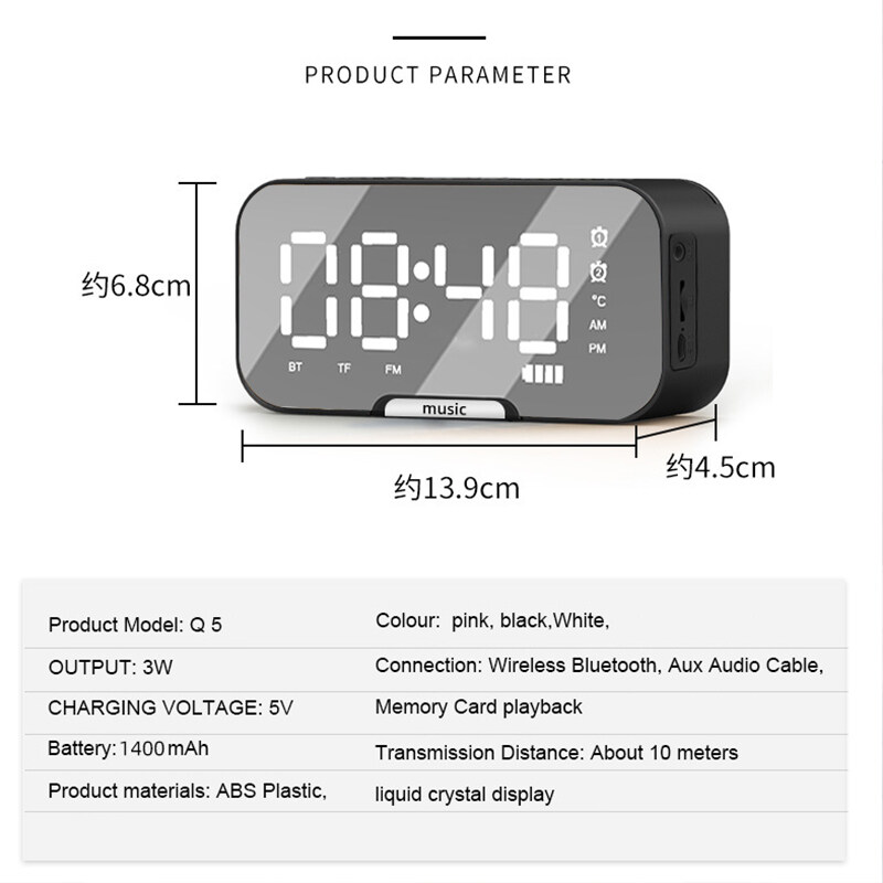 The multifunctional bluetooth speaker support bluetooth, AUX, and TF card, and with FM, alarm clock, makeup mirror, phone holder, night light and collection reminder function.