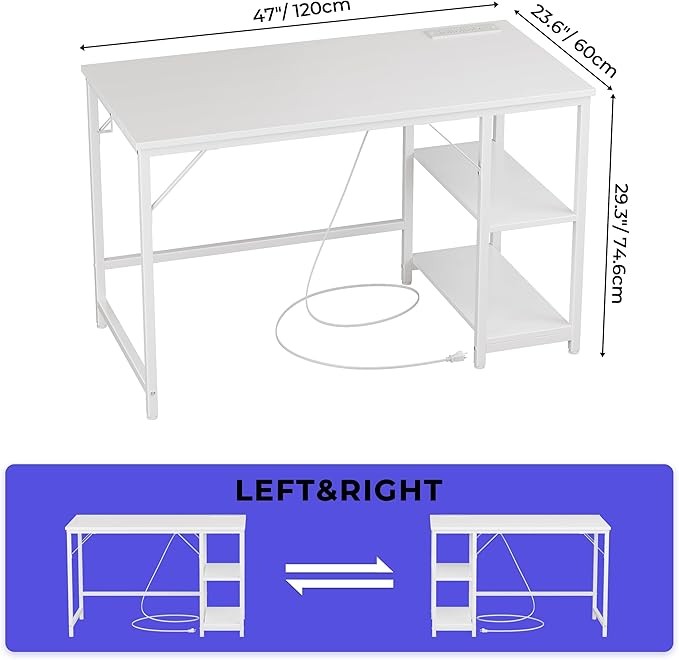 【Reversible Storage Rack】 The home office desk features a reversible storage rack that can be installed on either side, with adjustable gradients on the uppermost shelf for various item sizes, making it a versatile white table.