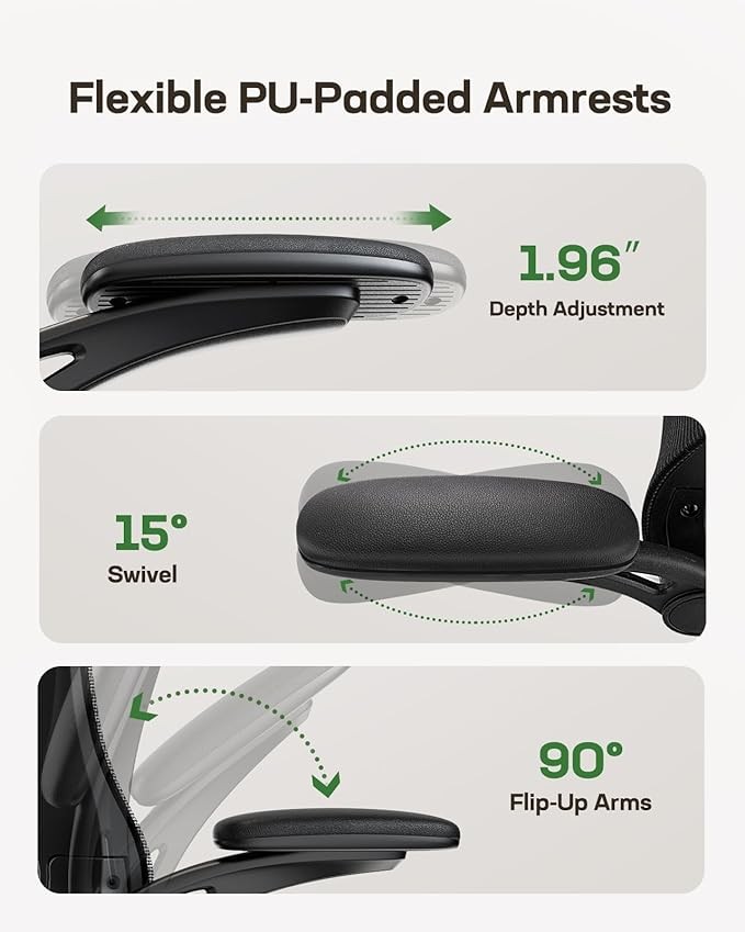 FLEXIBLE ARMRESTS: Rest your arms on the comfortable PU-padded surface of these smoothly rounded armrests. Move them forward or back and swivel them left or right to find the optimal arm position. Flip the armrests up when you want more freedom or to easily slide the chair under the desk.