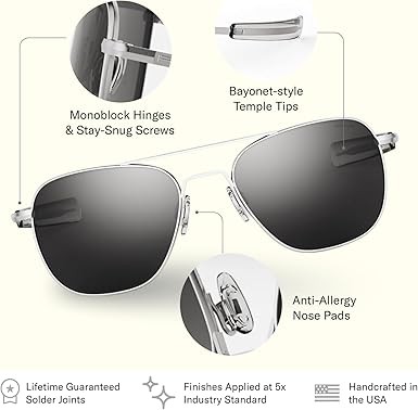 HANDMADE IN THE USA EYEWEAR: At Randolph, we meticulously craft premium eyewear with attention to detail and an unwavering commitment to quality. Family owned and operated since 1973, our durable and comfortable products are designed and manufactured in Randolph, Massachusetts to stand the test of time.